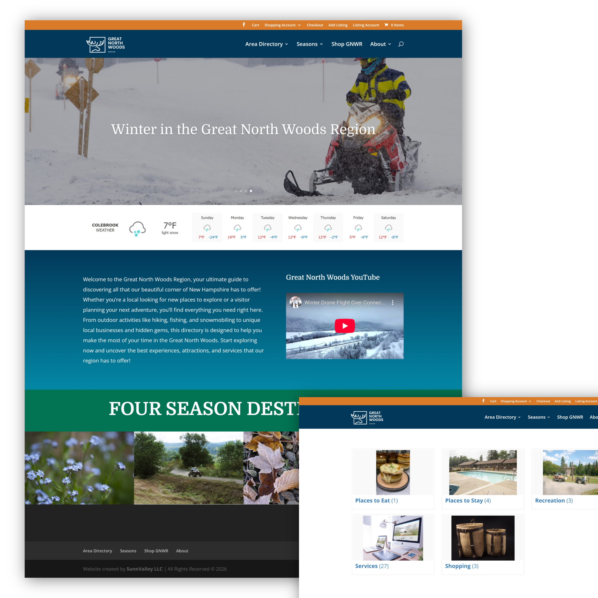 Regional tourism and community directory showcasing businesses, attractions, lodging, and events across the Great North Woods. The site makes it easy for visitors and residents to explore the region, discover local services, and connect with the communities that make Northern New Hampshire unique. This website is a free directory build by us for the area to help businesses with SEO. It gets great organic traffic.